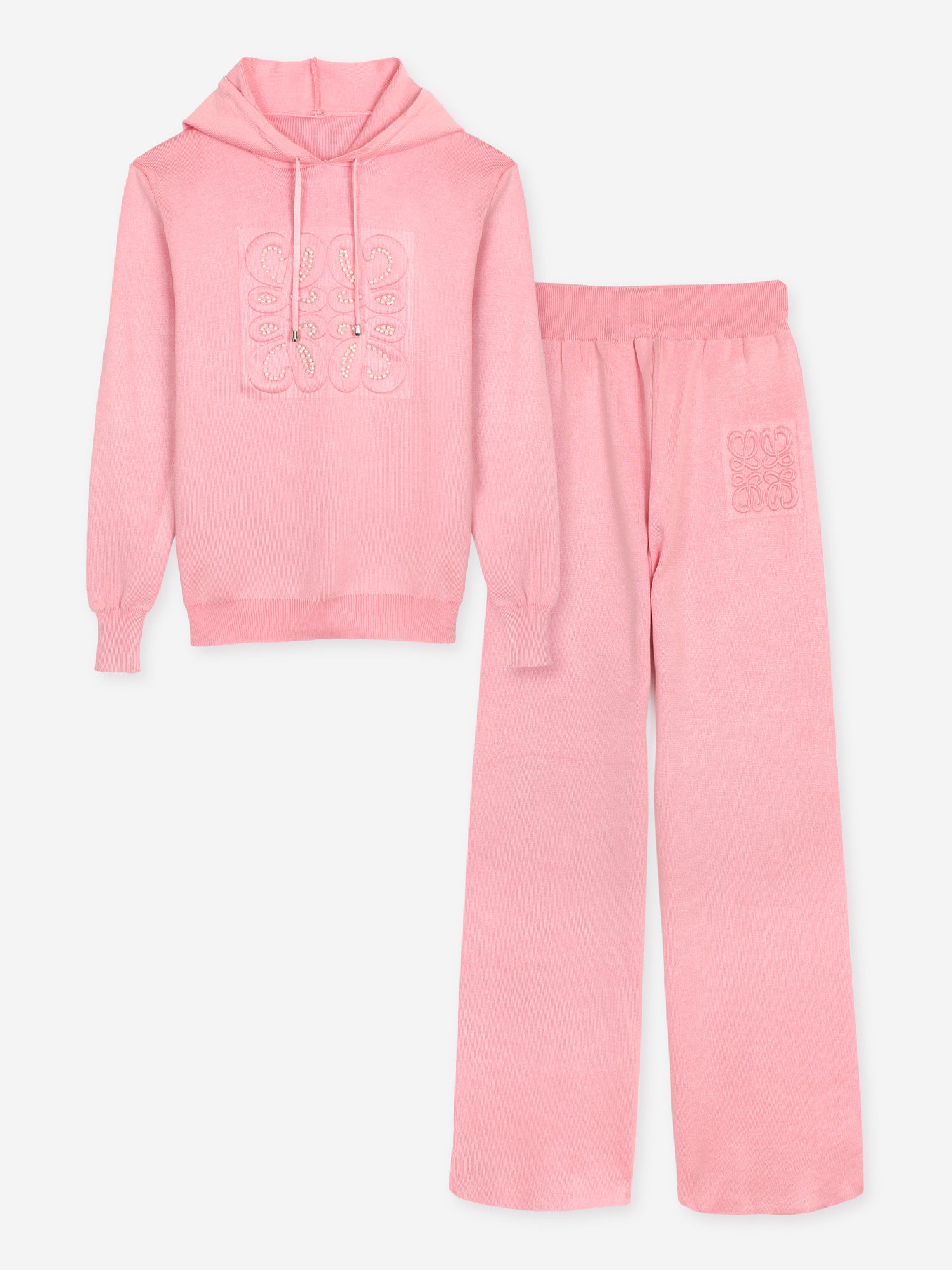 Details: Intricate pearl-like embellishments, embossed design, subtle emblem on trousers, cozy hood.