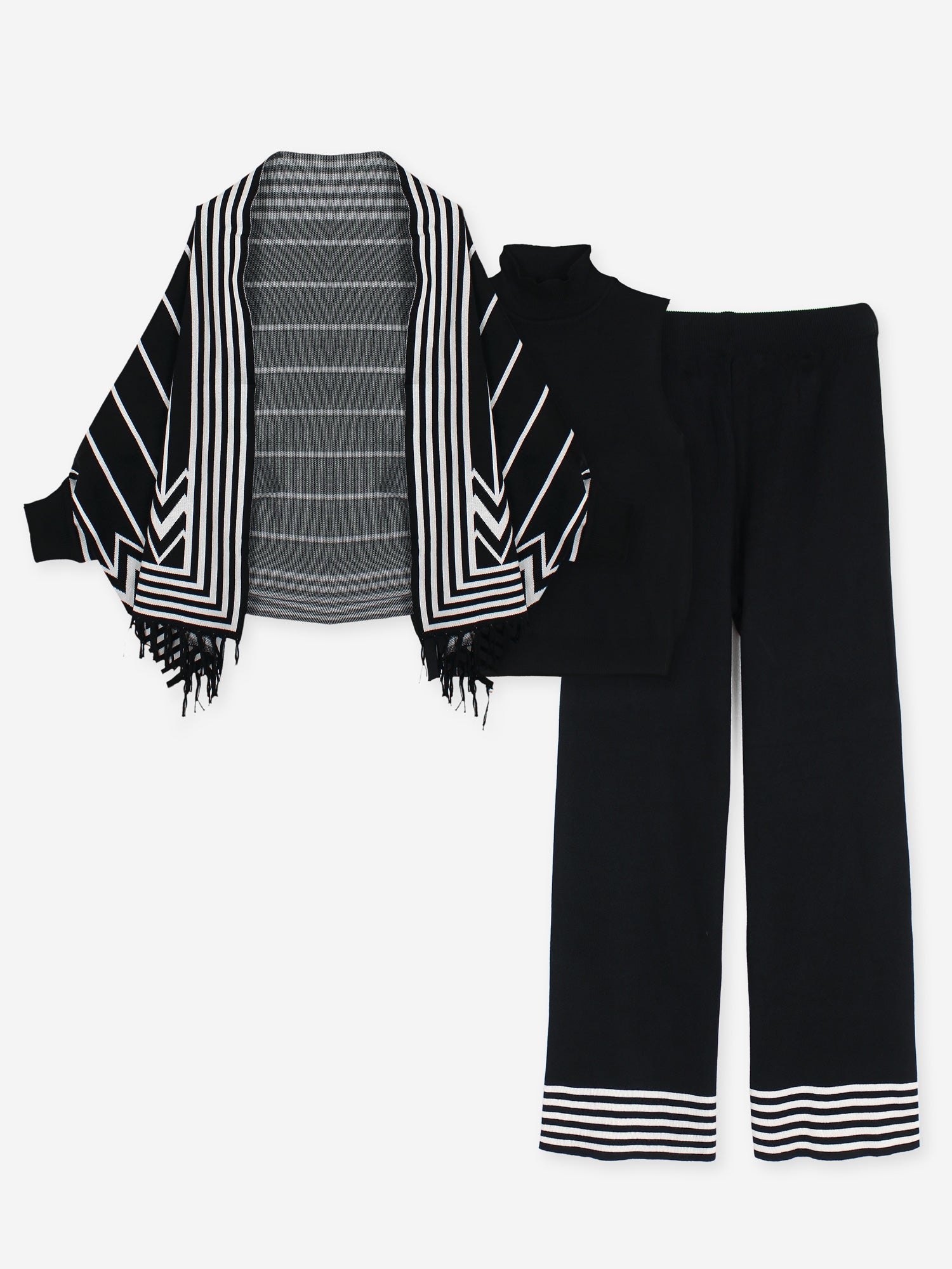 Set includes: Sleeveless Mock-Neck Top, Wide-Leg Trousers & Graphic Poncho