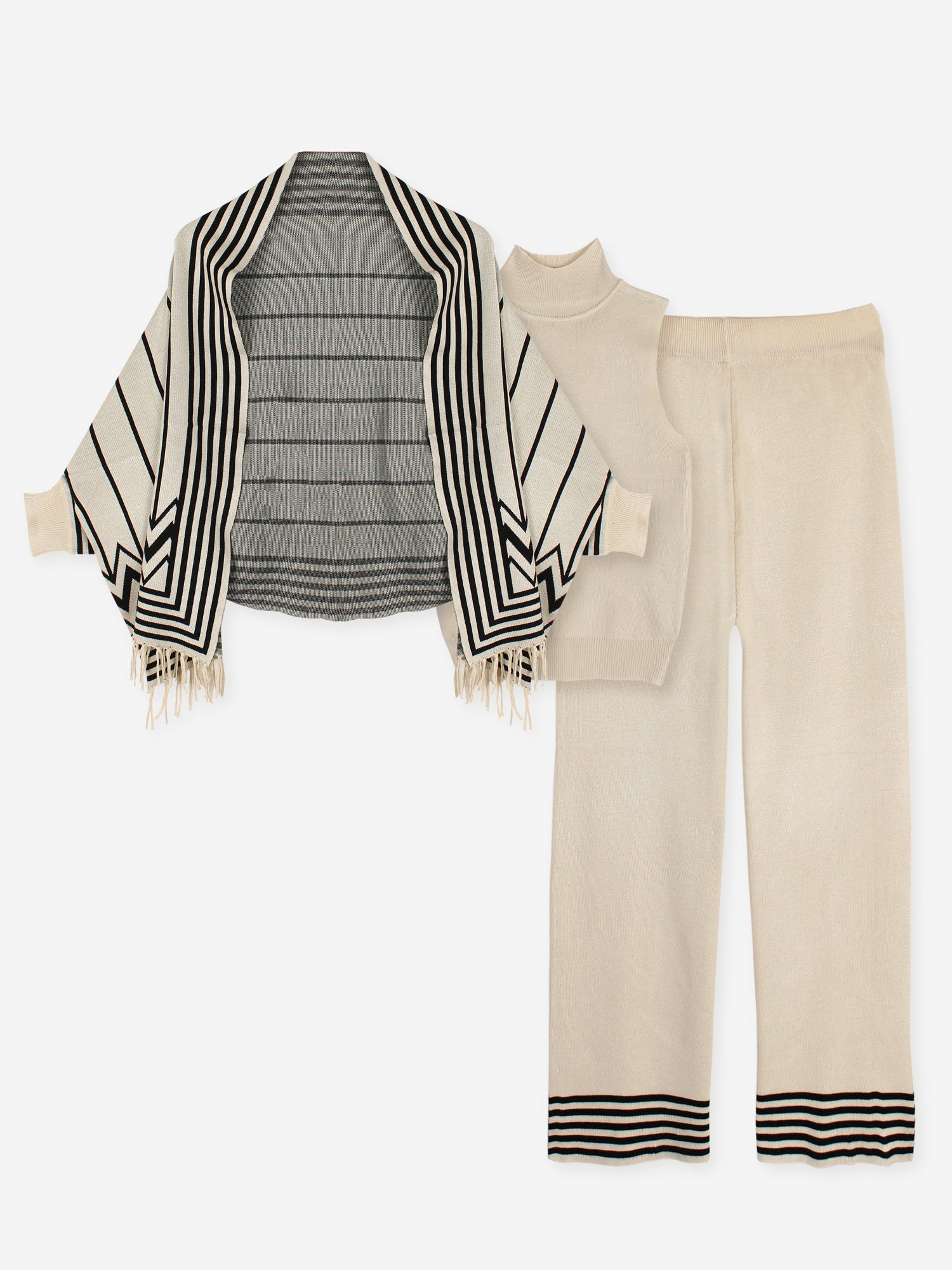 Set includes: Sleeveless Mock-Neck Top, Wide-Leg Trousers & Graphic Poncho